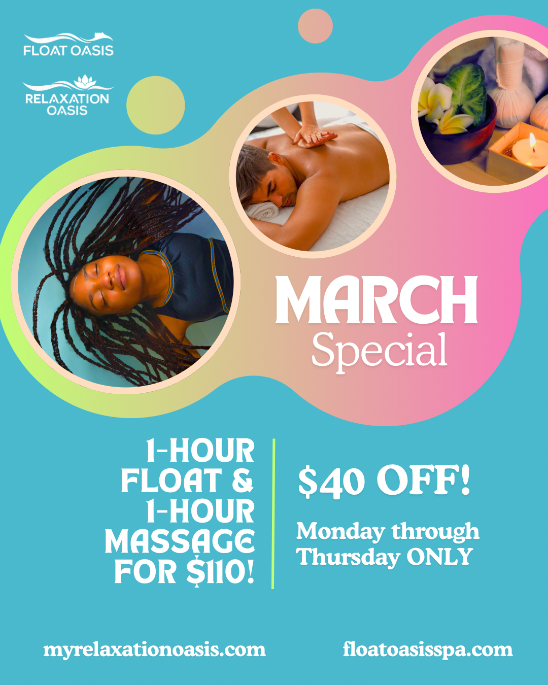 Monday through Thursday in the month of March, the 1 hour float and 1 hour massage combo is just $110 per person.